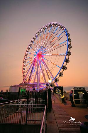 Capturing the majestic Ferris wheel at the National Harbor in Washington, DC at sunset is an ethereal symphony of color and wonder. The setting sun casts a warm, golden glow upon the sky, blending shades of orange and pink that dance in harmony with the approaching twilight. Against this canvas of vibrant hues, the Ferris wheel stands tall, adorned with a mesmerizing array of twinkling lights reflecting the fading sunlight. As darkness embraces the horizon, the silhouette of this iconic landmark emerges, etched in the glow of a city alive with anticipation for the night ahead.