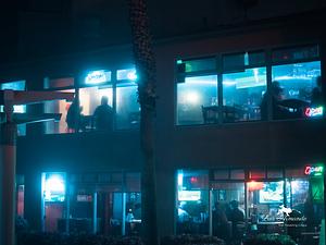 'Rainy Day Revelry' unveils the heartwarming scene at a vibrant 2-story restaurant and bar in the heart of Imperial Beach, California. Gazing in from the outside, the inviting ambiance comes to life as patrons enjoy good food, drinks, and lively conversations. The day's sports action unfolds on TV monitors, creating an engaging atmosphere for all. Through the foggy glass windows, the glow of colorful open signs beckons passersby, while the soft blue lighting casts a cozy and welcoming mood. On this rainy day, this photograph encapsulates the sense of community and togetherness within the friendly confines of the Imperial Beach eatery.
