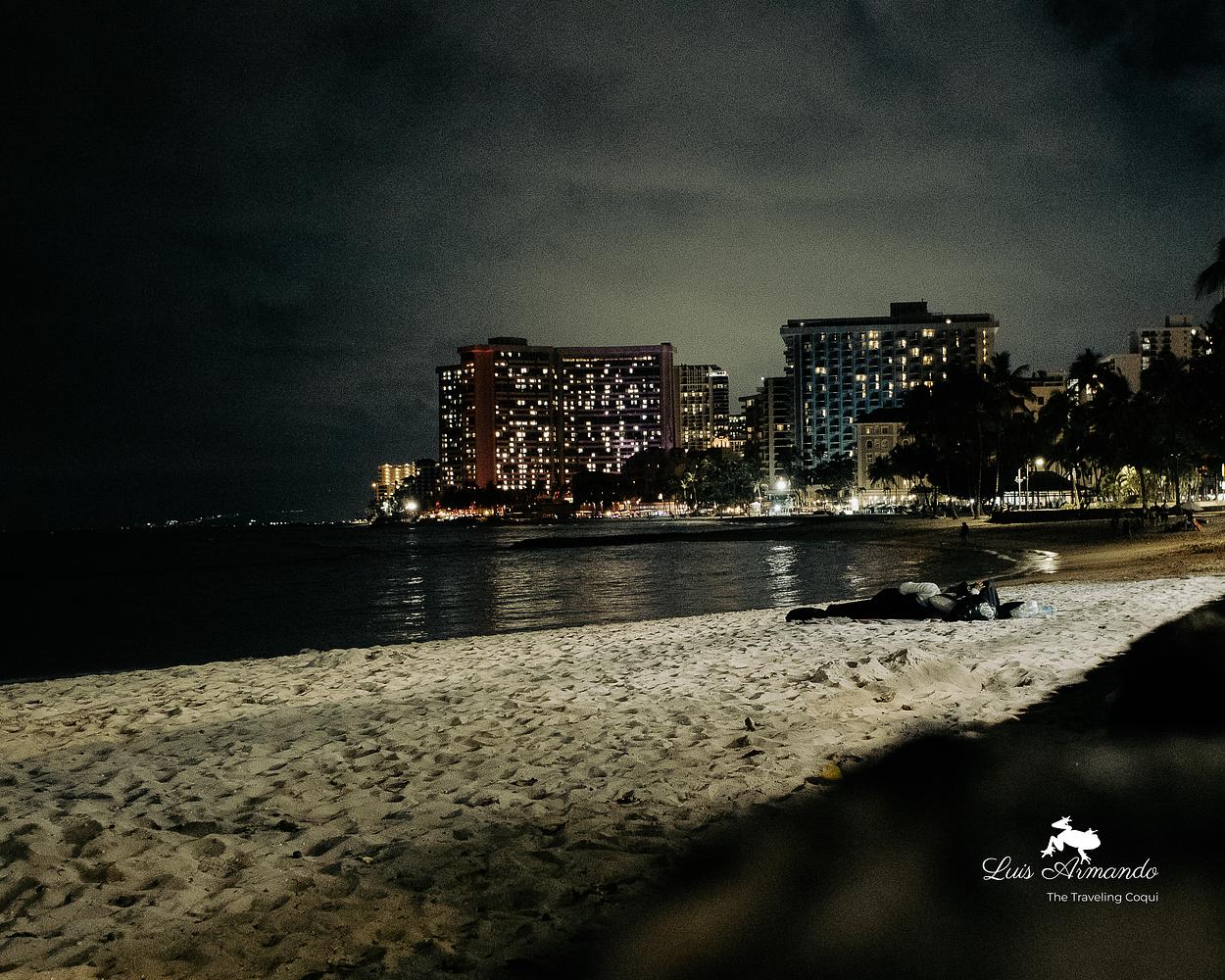 'Waikiki Dreamscape' transports you to the tranquil shores of Waikiki beach under the moon's soft glow. The serene waters gently lap at the shore, creating a soothing symphony of waves. Streetlights cast their warm, white glow upon the sand, illuminating a lone figure, a man, laying down on a towel, embracing the peaceful night. In the distance, the elegant Waikiki hotels stand tall, their lights reflecting on the water, adding to the enchantment of the scene. This photograph is an invitation to indulge in the calm beauty of Waikiki's night, where the world pauses, and dreams come to life."