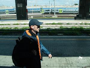 'Urban Transit Rhythm' captures the pulse of the city as a man in a baseball hat strolls alongside the train at the station. The photograph, taken from inside the train, offers a unique perspective, with train tracks at the distance and another train in view. The man, sporting a blue jacket, black sunglasses, and a black backpack, becomes a captivating character in this urban symphony, where the meeting of traveler and train echoes the rhythm of everyday life."