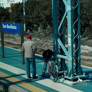 'San Bonifacio Commuter' invites you to a quiet moment at the train platform in San Bonifacio, Italy. In this evocative photograph, a man with a distinctive red cap stands beside a sign tower, his bicycle and bag by his side. His thoughtful posture conveys the essence of a daily commuter, waiting for the familiar arrival of his train. This scene captures the serene beauty of everyday life, where the rhythm of routine meets the charm of an Italian town. It's a glimpse into the unhurried moments of a commuter's daily ritual.