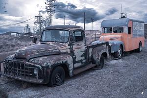 In a desolate ghost town, time stands still as a rusted pickup and a weathered cargo van sit abandoned. Their stories are long forgotten, surrounded by the vast desert. These relics of a bygone era rest under the moody, cloud-covered sky, evoking a sense of nostalgia and quiet mystery. The faded paint and cracked windows tell tales of countless journeys, now silenced by the desert's timeless embrace.